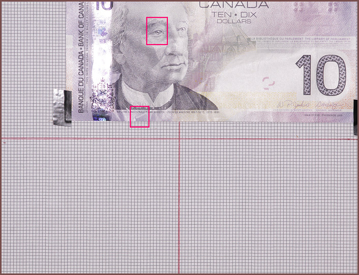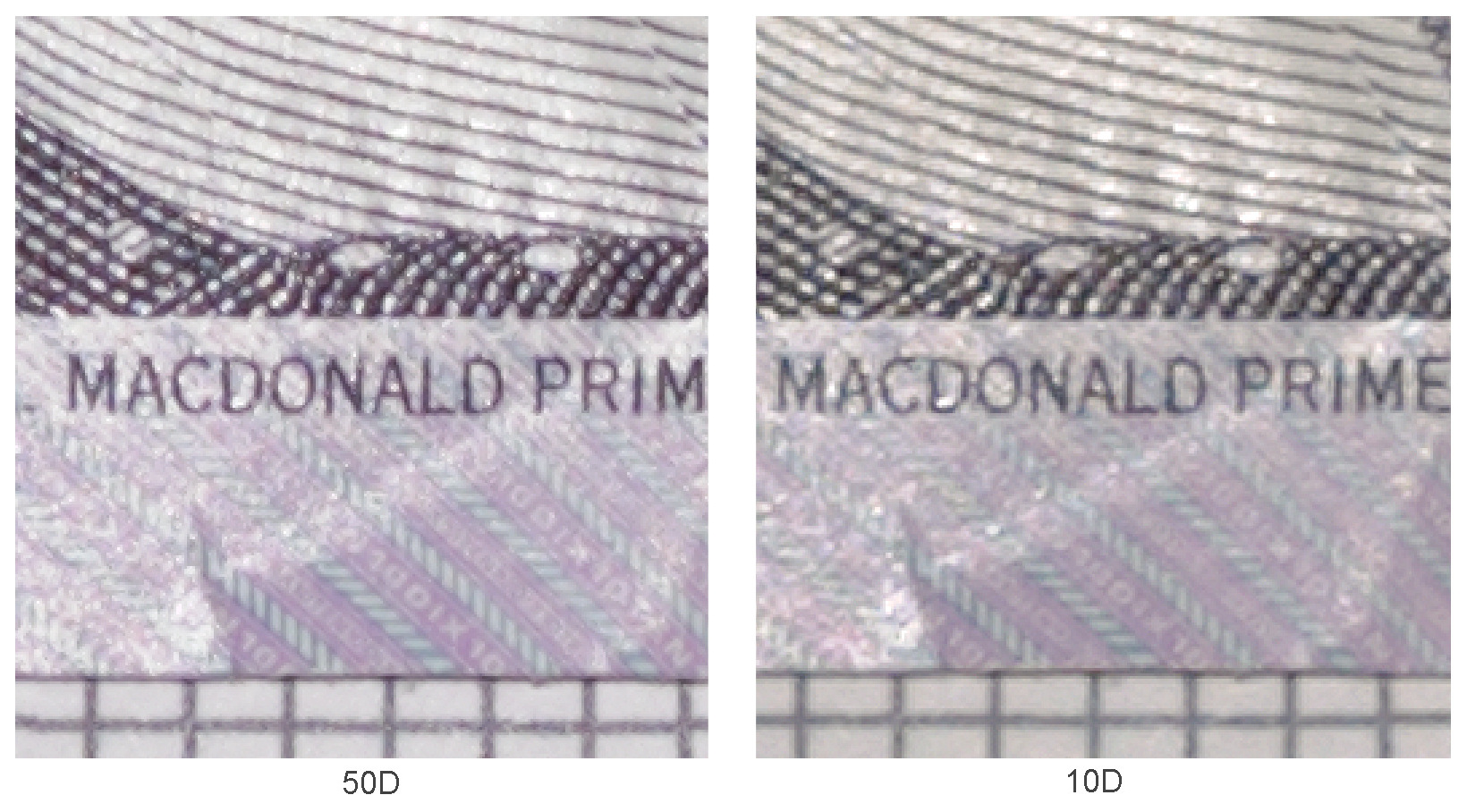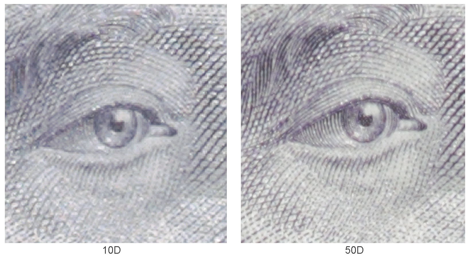 The 10D and 50D images were shot in RAW and converted to TIF with Canons DPP. No sharpening was applied in the RAW conversion but the 10D file was sharpened optimally after rezing it up to match the pixel count of the 50D for a side by side comparison on the computer screen with 300% magnification. Two areas of the test target with fine detail were cropped from each file. Color balance and contrast were tweaked in the TIF files. Finally the cropped images were converted to JPEG with minimal compression for display on the website. Other tests were also performed without flash and supported the flash results but are not displayed here. The Comparison images below are both from