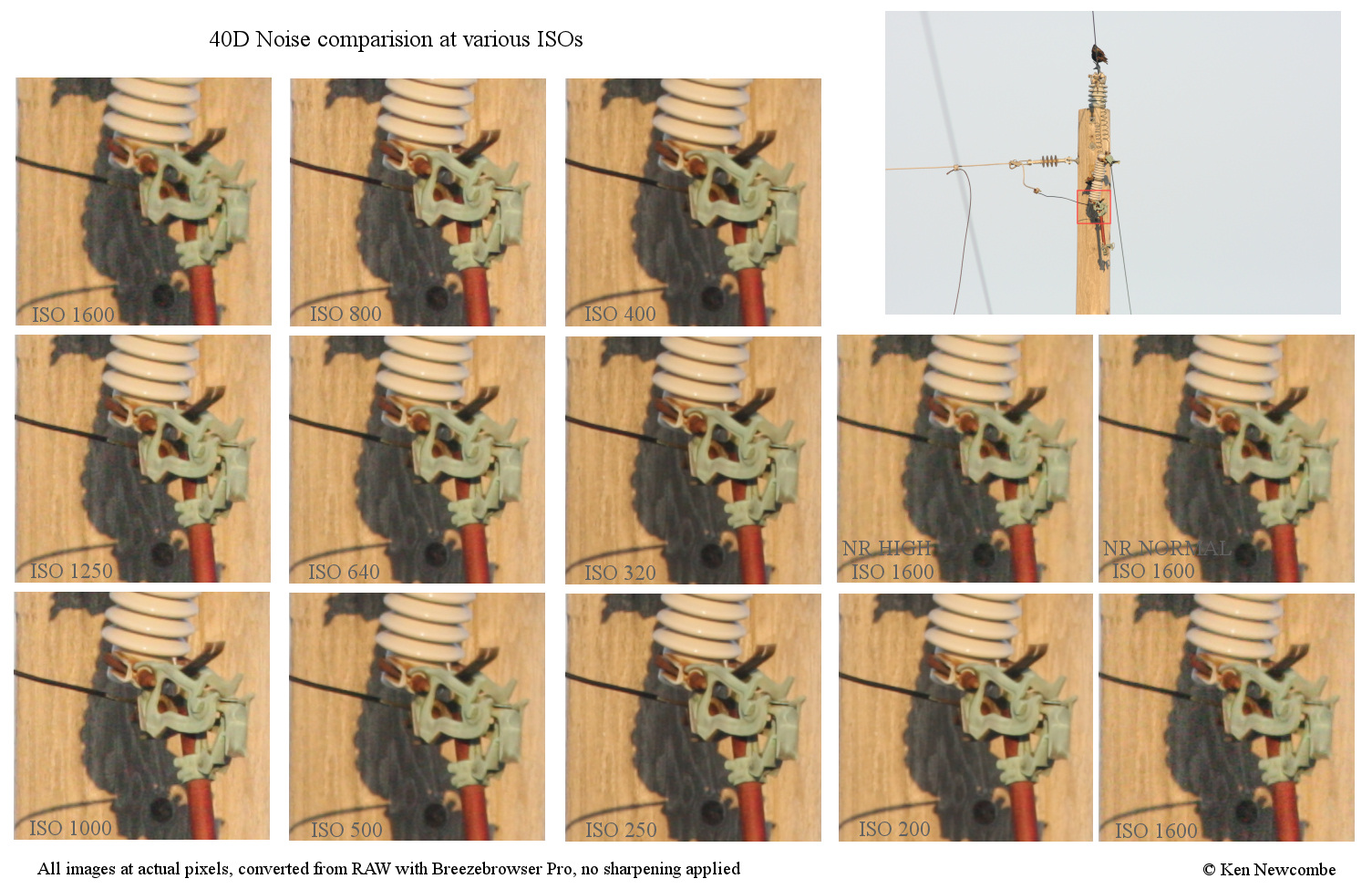 ISO noise comparison test Recently at a shoot where the light was low I had cause to use the higher ISO settings in the my Canon 40D camera. Usually I try to stay at ISO 400 where I have always been satisfied with the image quality. I was surprised at the quality of the images at the higher ISOs so I decided to do a comparison test. My Canon 300mm f4L lens was set at f5.6, and the shutter speed varied to allow the same exposure on all images as the ISO was changed in 1\3 EV increments from ISO 200 -1600. Hilight tone priority was enabled which does not allow ISO 100 from being used. The subject was a telephone pole and insulator in sunlight with shadows behind the insulator. The camera was set to RAW and the files were converted to TIF with Breezebrowser Pro. No sharpening or noise reduction was applied with the exception of the two ISO 1600 images that were converted with Noise reduction set for comparison purposes and labeled as such.Conclusion: As the ISO is increased color noise appears in the darker areas as would be expected. Even at ISO 1600 it does not appear overly objectionable in the lighter shadows and the use of Noise reduction software is effective in removing most of it with a small penalty in resolution. As always exposing properly (just shy of saturation) is the key to low noise.