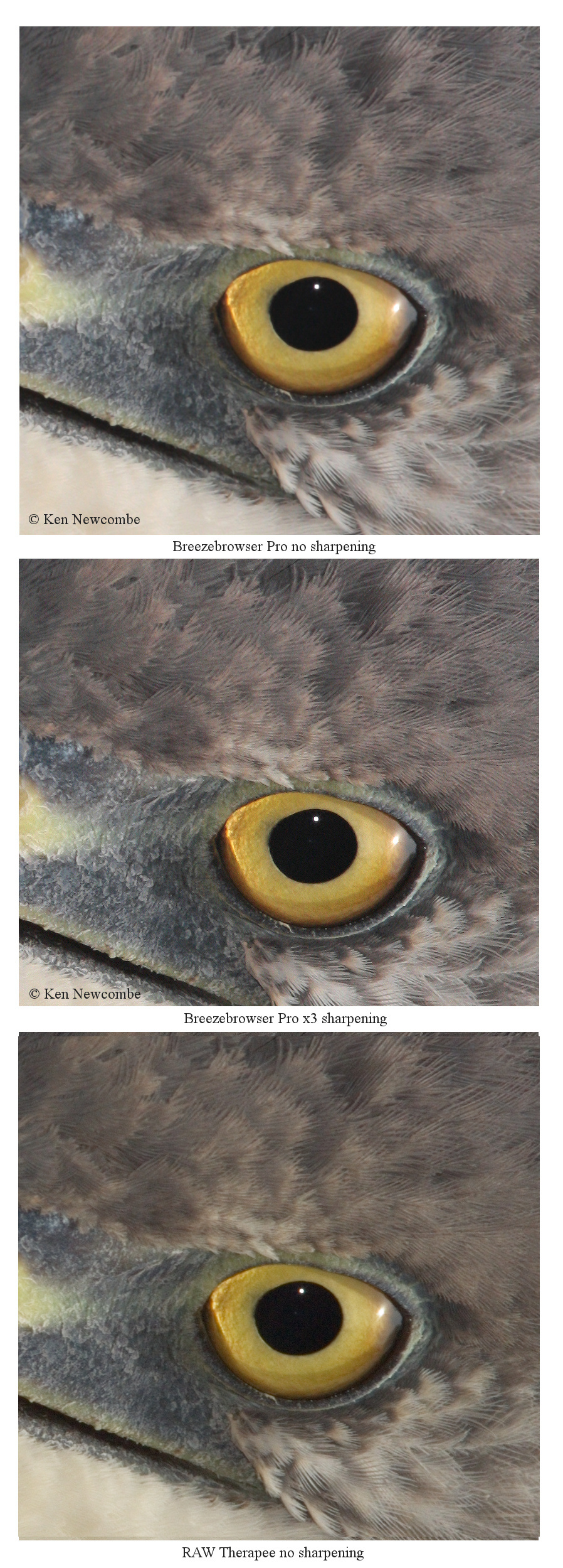 The Great Blue Heron image compares a crop with Breezebrowser with and without sharpening and Raw Therapee with no sharpening. At the size shown little difference is apparent between Raw Therapee and BB sharpened.